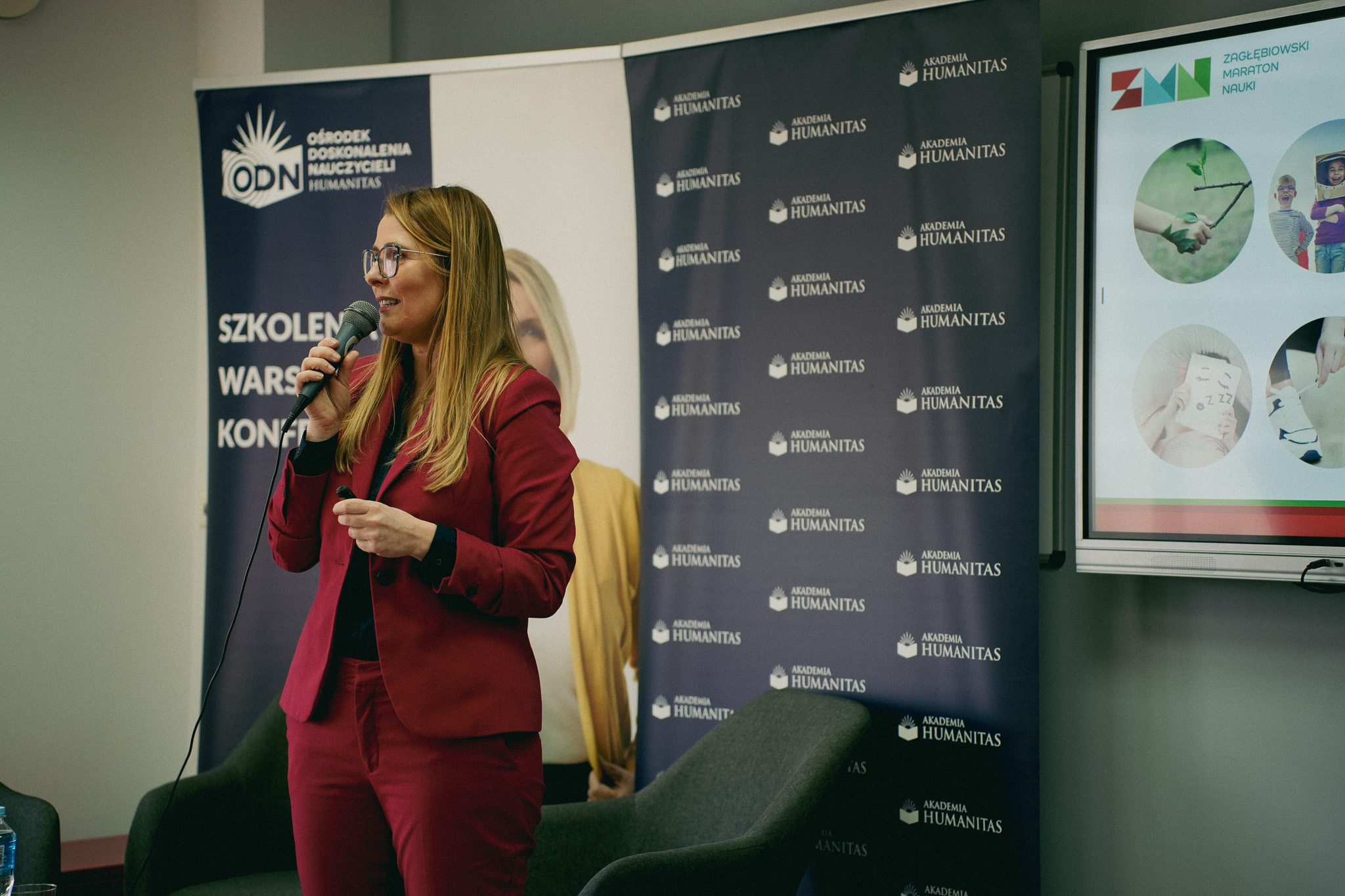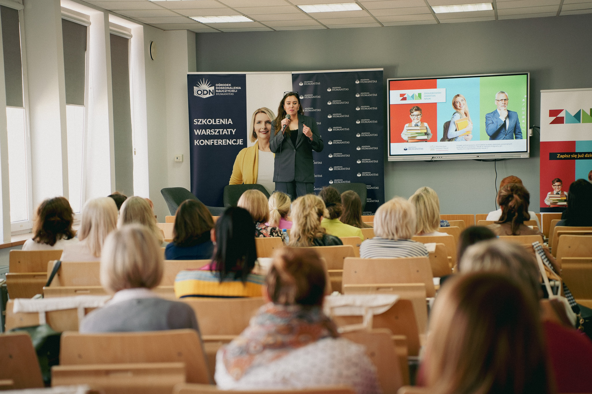 W imieniu Ośrodka Doskonalenia Nauczycieli Akademii Humanitas, przybyłych przywitała dziekan Wydziału Nauk Stosowanych – Ewa KrausStawiamy na kształcenie, na pomoc w rozwiązywaniu problemów z jakimi spotykacie się Państwo w swoich szkołach. Rozmawiamy o problemach na linii nauczyciel – uczeń, nauczyciel – rodzic ucznia. Tworzymy różne schematy i pomoce w radzeniu sobie w sytuacjach krytycznych. Teraz porozmawiamy i poznamy sposoby radzenia sobie ze stresem, przemęczeniem. I mam nadzieję, że razem zadbamy o nasz własny dobrostan. O nas samych. O naszą odporność psychiczną, która odgrywa kluczową rolę w byciu liderem.
