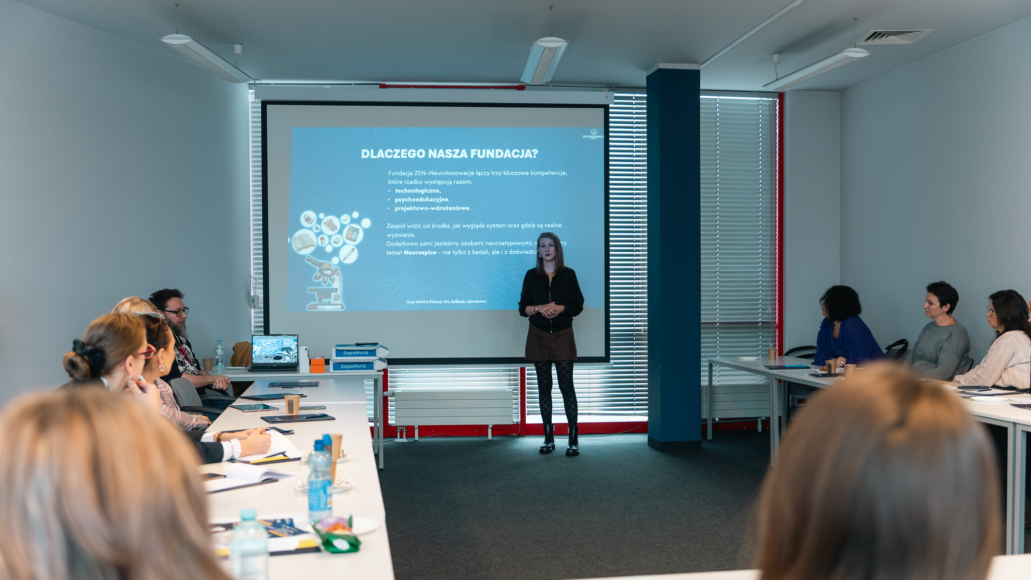 Po przerwie kawowej goście wzięli udział w praktycznych warsztatach prowadzonych przez specjalistów z Fundacji ZEN–NeuroInnowacje: Katarzynę Wieszałkowską oraz Grzegorza Gorola. Eksperci zaprezentowali hybrydową grę edukacyjną wspierającą rozpoznawanie różnorodności poznawczej i lepsze zrozumienie neuroatypowości w środowisku szkolnym. Warsztat wywołał żywą dyskusję i dostarczył uczestnikom wielu inspiracji do wykorzystania w codziennej pracy.