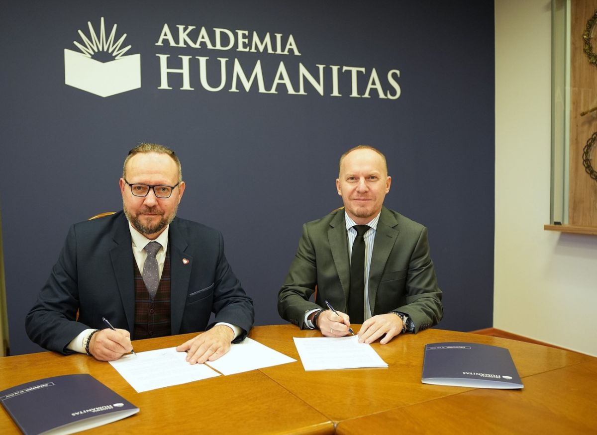 Dwóch mężczyzn w garniturach siedzi przy stole i podpisuje dokumenty. Przed nimi leżą teczki z logo Akademii Humanitas, a w tle widoczna jest ściana z dużym napisem ‘Akademia Humanitas’. Obaj patrzą w stronę aparatu.