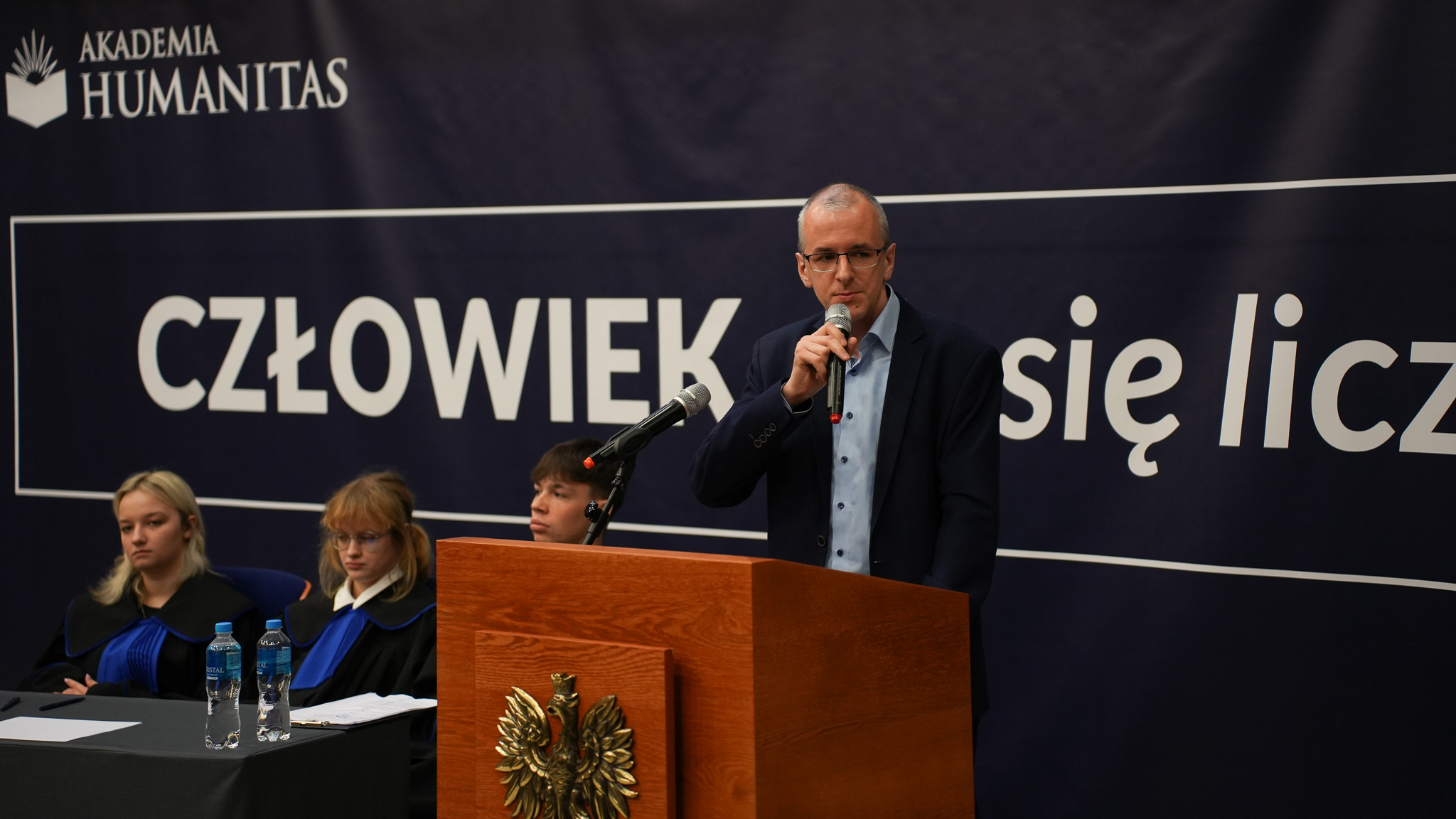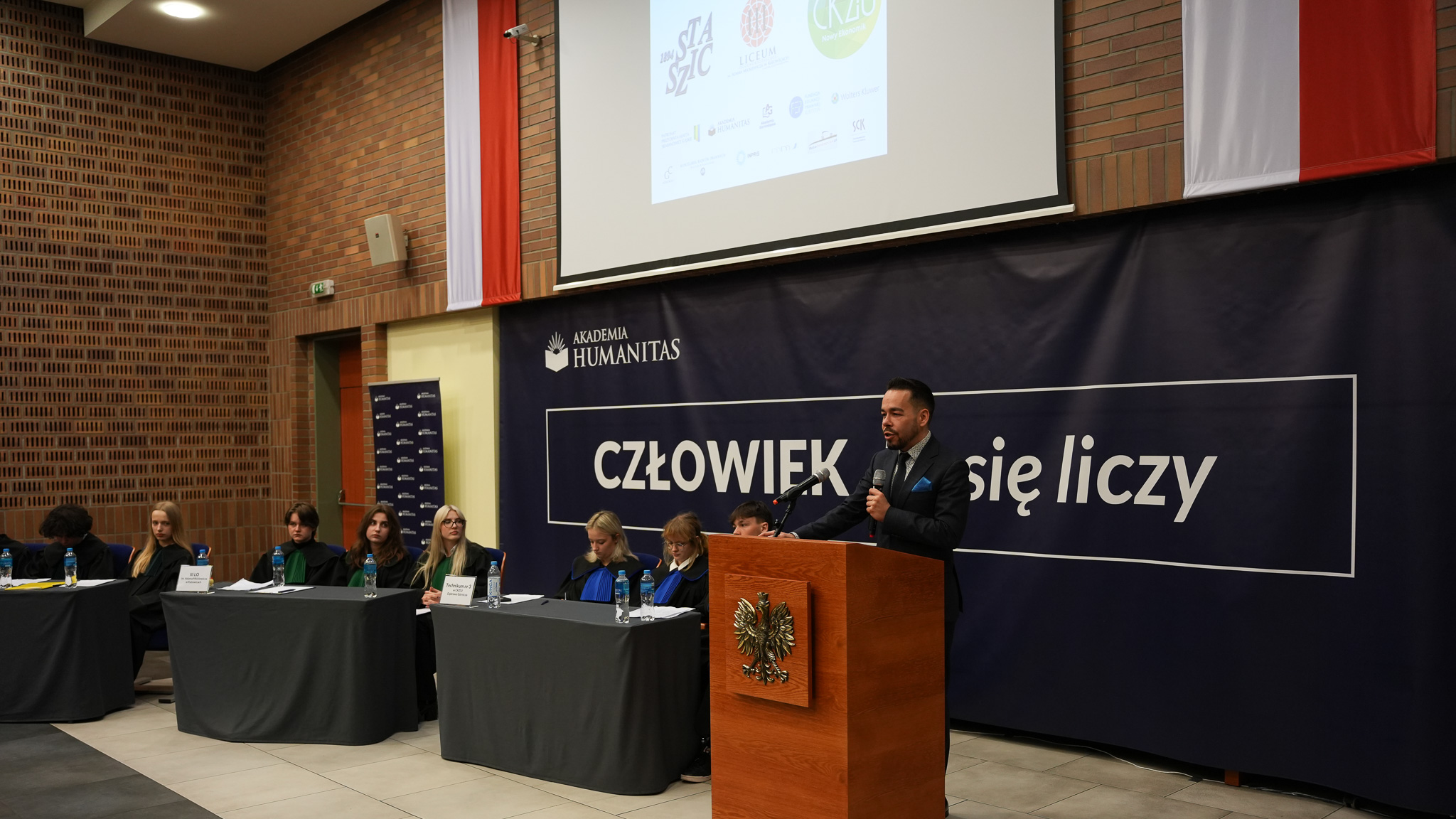 Przybyłych uczestników i gości powitał w murach Akademii Humanitas – prof. Michał Kaczmarczyk, rektor uczelni. Również słowa powitania i wyrazy uznania dla uczestników wygłosił organizator konkursu, wicedyrektor I LO im. Śniadeckiego – pan Michał Szwestka.