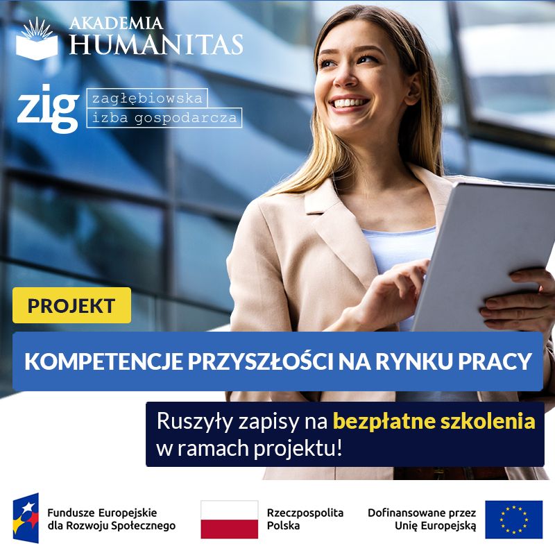 Akademia Humanitas wraz z Zagłębiowską Izbą Gospodarczą realizuje projekt „Kompetencje przyszłości na rynku pracy” nr FERS.01.05-IP.08-0512/23. Projekt dofinansowany jest ze środków Europejskiego Funduszu Społecznego Plus, w ramach Funduszy Europejskich dla Rozwoju Społecznego 2021-2027 i ma na celu wypełnienie luk kompetencyjnych (skills gap) zgodnych z potrzebami rynku pracy.