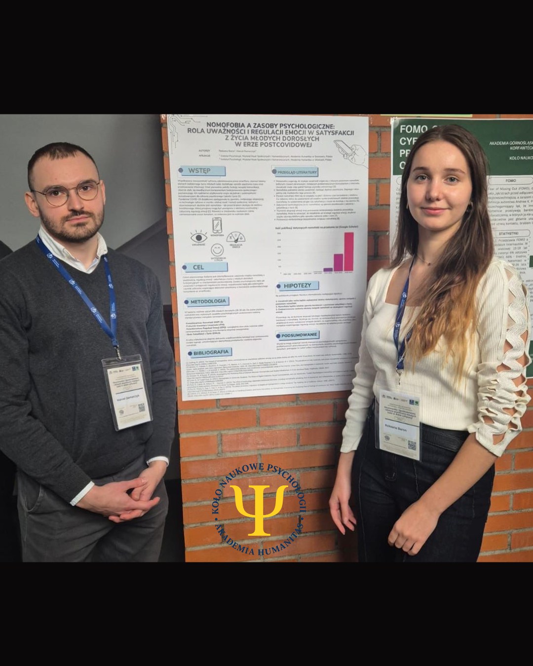 Uznanie zdobyły także Marcel Demarczyk i Roksana Baron, autorzy interesującej prezentacji posterowej pt. Nomofobia a zasoby psychologiczne: Rola uważności i regulacji emocji w satysfakcji z życia młodych dorosłych w erze postcovidowej. Ich praca podkreśla rosnące znaczenie nowych form uzależnień oraz potrzebę rozwijania kompetencji psychologicznych wśród młodych ludzi.