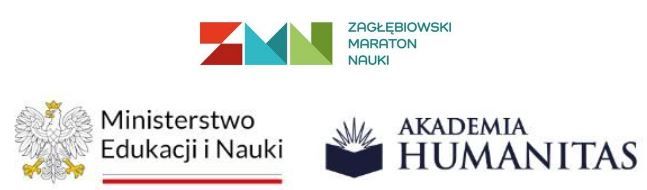 Zestaw logotypów partnerów wydarzenia: Zagłębiowski Maraton Nauki, Ministerstwo Edukacji i Nauki oraz Akademia Humanitas.