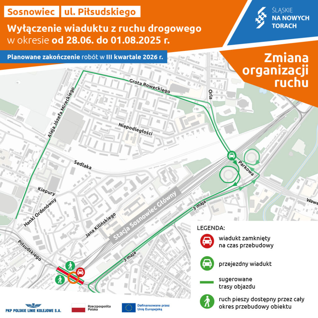 Od 28 czerwca 2025 r. do 1 sierpnia 2025 r. zamknięty będzie ruch samochodowy i tramwajowy pod wiaduktem kolejowym w ciągu ulicy Piłsudskiego w centrum Sosnowca.