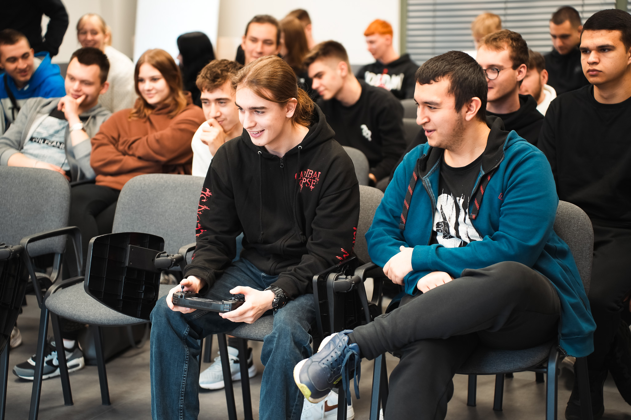 Druga grupa uczestników miała okazję poznać świat wirtualnej rzeczywistości (VR) dzięki warsztatom prowadzonym przez Szymona Potockiego i Radosława Pilnickiego. Uczniowie sami przymierzyli okulary VR, poznając dostępne oprogramowanie. W ramach warsztatów odbył się również pokaz druku 3D oraz pokaz robota kroczącego, którym uczniowie mogli samodzielnie sterować. Zajęcia te wzbudziły szczególne zainteresowanie wśród uczniów pasjonujących się tematyką VR i programowania.