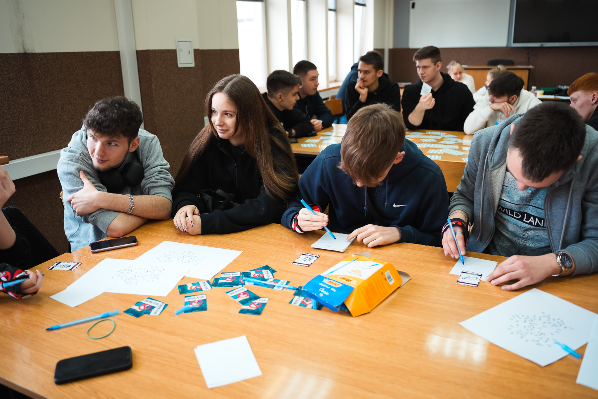Nie tylko teoria, ale również praktyczne doświadczenie było tym, co przygotowaliśmy dla naszych gości. Uczniowie zostali podzieleni na dwie grupy, aby w pełni skorzystać z przygotowanych przez nas warsztatów. Pierwsza z nich dotyczyła Bezpieczeństwa i Higieny Pracy (BHP), które poprowadziła Justyna Pokładnik – wykładowca Akademii Humanitas, a zarazem specjalista BHP i właścicielka firmy „TAM” specjalizującej się w szkoleniach z zakresu bezpieczeństwa i higieny pracy. Uczniowie układali puzzle dotyczące tematyki hałasu, wzięli udział w grze terenowej z kodami QR, sprawdzili się w memory BHP, a także zmierzyli z zadaniem z goglami zmęczeniowymi i „amputowanym” kciukiem. Popularnością cieszyły się również gry logiczne takie jak Tabu ratownicze dotyczące pierwszej pomocy.