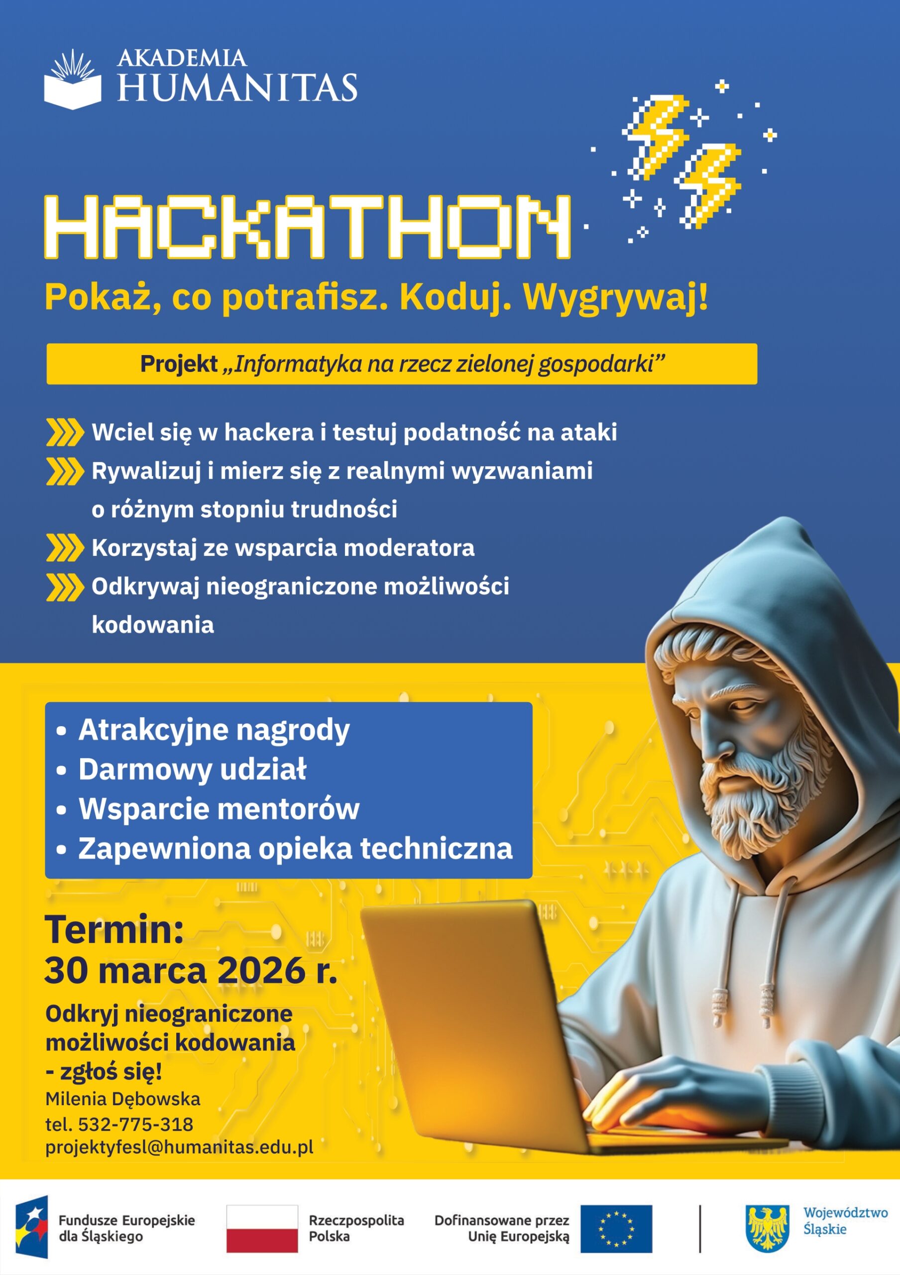 Akademia Humanitas w Sosnowcu zaprasza uczniów szkół ponadpodstawowych do udziału w wyjątkowym wydarzeniu – HACKATHONIE. Wydarzenie odbędzie się w kilku terminach 11, 25 i 30 marca 2026 roku w siedzibie uczelni przy ul. Kilińskiego 43.